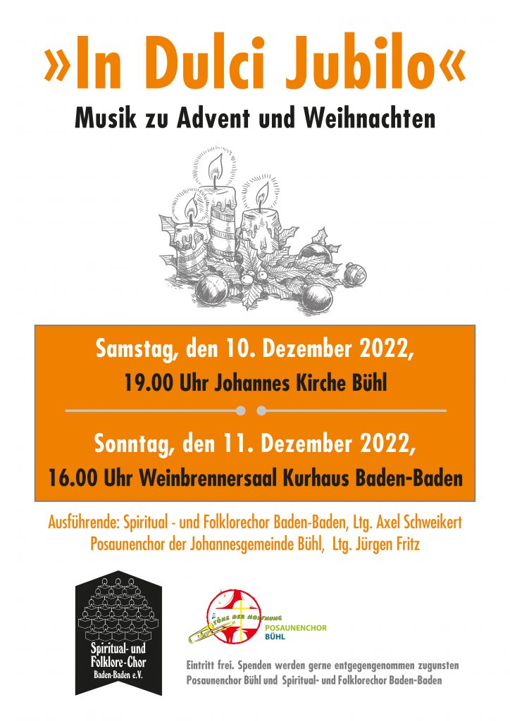 Unter dem Titel „in dulci jubilo“ beschenkt uns der Spiritual- und Folklorechor Baden-Baden gemeinsam mit unserem Bühler Posaunenchor mit adventlich-weihnachtlicher Musik in unserer Johanneskirche.