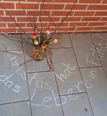 „Schließen Sie Ihr Ladegerät an“, so warnt mich mein Smartphone, wenn der Akku leer ist. Ich glaube, Gott ist so ein ähnliches Warnsystem in meinem Innern, um mir zu sagen: „Komm in meine Gegenwart und lass dich von mir erfüllen! Verbinde dich mit mir, denn du kannst mich in jedem Augenblick deines Lebens entdecken. Auch in den schwierigen und kraftzehrenden Momenten bin ich an deiner Seite, um dich zu stärken!“ Das obenstehende Bild haben irgendwelche liebe Menschen in der Osternacht als Gruß auf dem Boden vor den Gemeindebüros hinterlassen. „Christus hat Leben in Fülle!“ Dieser Vers hilft, mir bewusst zu machen, dass ich mit Jesus Anschluss an die große Powerbank Gottes habe. Aus seiner Kraft kann ich die anstrengenden Zeiten aushalten, weil ich weiß, dass er mir in jedem Moment meines Alltags begegnen und mich erfüllen will.