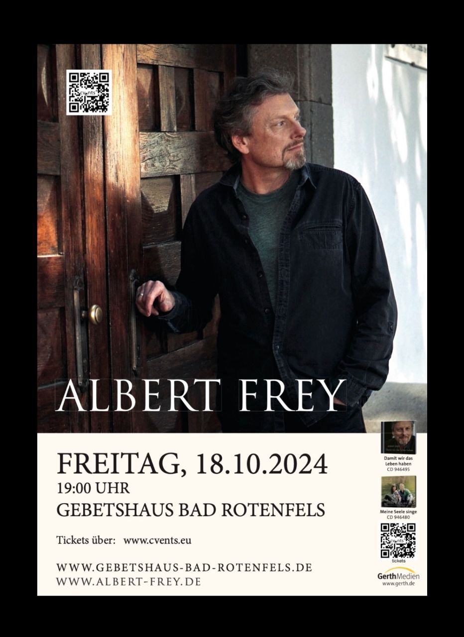 - Zuletzt noch einmal der Hinweis auf ein Konzert mit Albert Frey in Bad Rotenfels (Plakat im Anhang), leider gerade an unserem Gemeindefreizeit-Wochenende. Aber ein paar Leute bleiben ja auch hier 😊.
