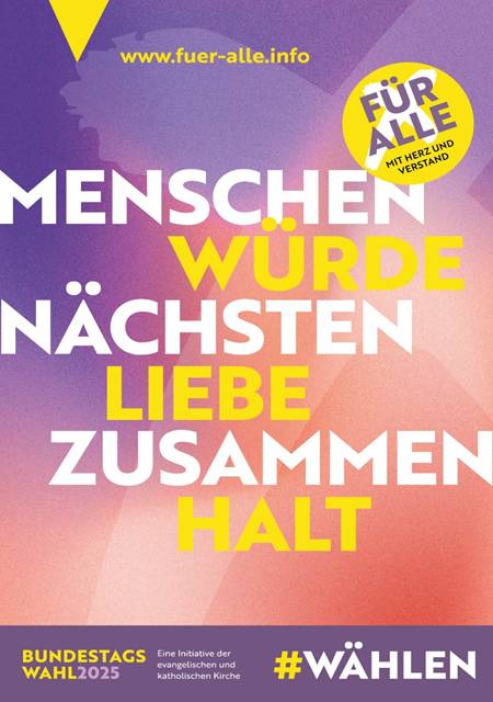 Im 1. Timotheusbrief wird uns die Mitverantwortung für die Politik ans Herz gelegt (1. Tim 2,1-6): durch unsere Gebete (unsere Fürbitten und ausdrücklich unsere Dankbarkeit). Aber auch indem wir konkret anpacken und uns praktisch darum kümmern, dass allen Menschen geholfen wird: im Sinne der Menschenwürde und der Nächstenliebe, im Sinne der Gerechtigkeit und des Zusammenhalts (siehe auch 1. Tim 6,17-19). Und helfen zur Lebensgemeinschaft mit Gott und zur Erkenntnis der Wahrheit und Freiheit in Christus. Darum: „Prüft alles, das Gute behaltet“ (1. Thess 5,21) Und bleibt im Gespräch mit Gott, auch über die eigene Wahlentscheidung! Das Plakat stammt übrigens von einer ökumenischen Initiative zur Wahl (https://fuer-alle.info/).