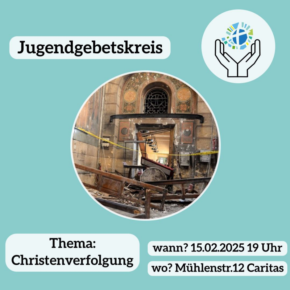 - Am kommenden Samstag, 15. Februar trifft sich um 19.00 Uhr der Jugendgebetskreis im Caritas-Haus im großen Saal. Klasse, dass sich regelmäßig Jugendliche aus unserer Gemeinde treffen, um miteinander für wichtige Themen in unserer Gemeinde, in unserem Land und weltweit zu beten!! Diesmal geht es um die Not verfolgter Christen. Neulich hab ich koptische Christen getroffen, die in ihrem Heimatland Ägypten immer wieder heftige Anfeindungen und Gefahren erleben. Was für ein Geschenk, dass wir in unserem Land Religionsfreiheit haben.